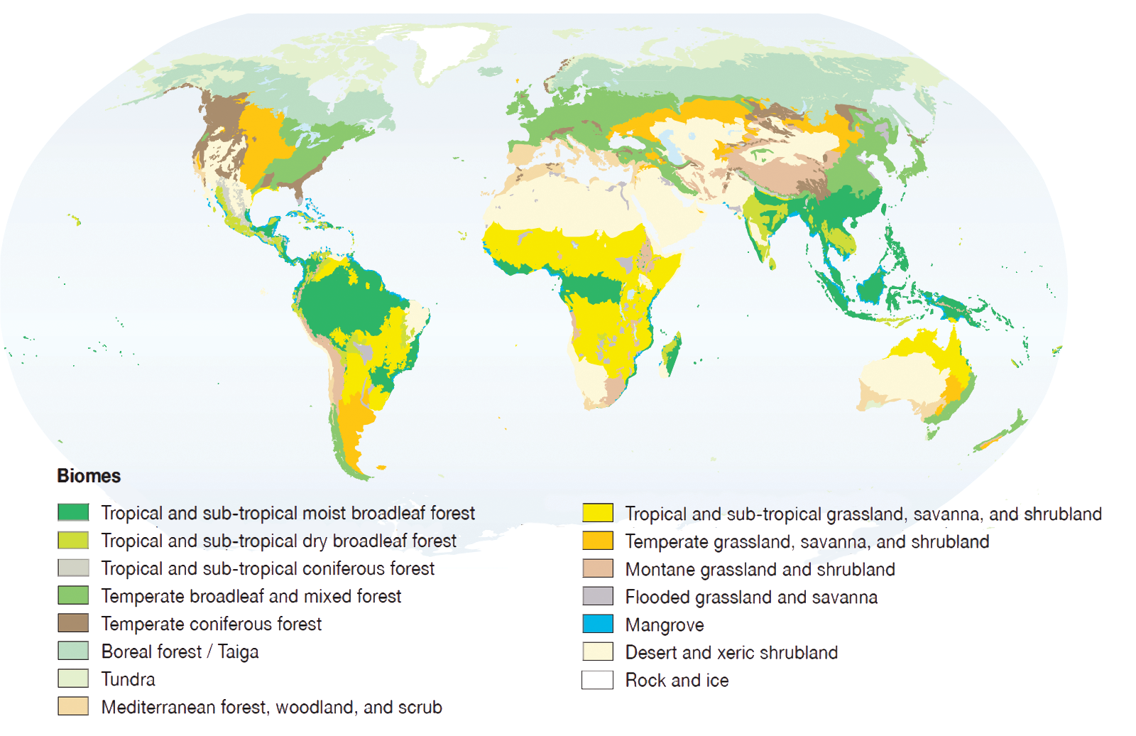 Forests are usually classified in terms of the predominant tree species – broadleaf, coniferous (needle-leaved), or mixed – and their leaf longevity (whether they are evergreen or deciduous). The main biomes of the world are presented in Fig. 2.3.1 and include the following forest types: