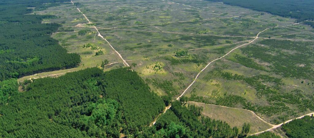 The situation is quite different in developing countries, especially in South America, South- East Asia and Oceania. With growing populations and economies, these countries always need more land for agriculture, factories, cities, towns, and roads. This land comes mainly from the destruction of tropical forests, and new forests that would absorb carbon dioxide are not being planted. A photograph taken in the tropical region of Argentina (Fig. 2.3.19) shows the beginning of the destruction of forest. Forest land previously belonging to the army was transferred to local government control in the early 2000s. Local government gave permission for agricultural development of the land, and the felling of trees began.