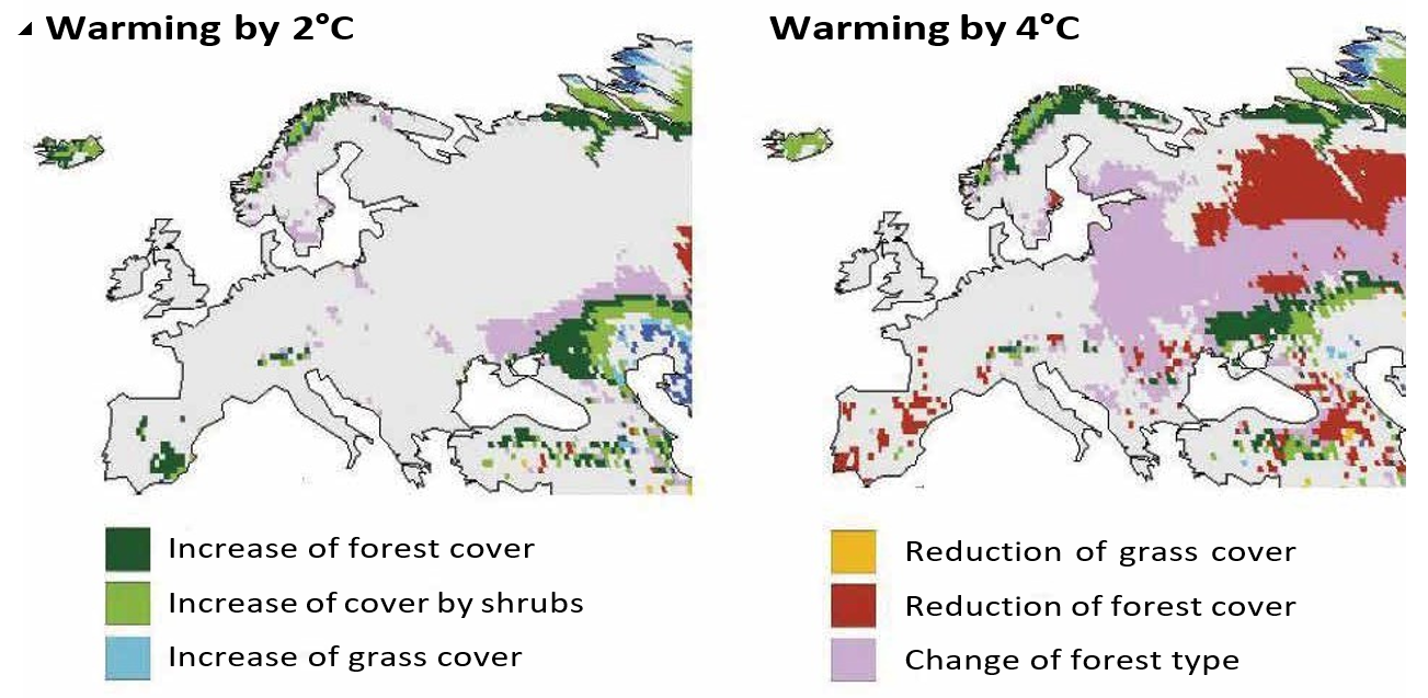 Figure 2.3.7 Forecast changes in forest cover in Europe by 2100, assuming global warming of 2°C and 4°C.