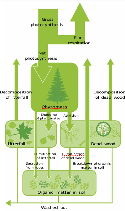 The phytomass pool consists of living plants: the trunks, branches, roots, leaves and needles of trees and shrubs, the leaves and roots of grass and moss (Fig. 2.3.11). As a rule, tree trunks account for most of the phytomass, but moss is also a major part of it in northern boreal and marshy pine forests.