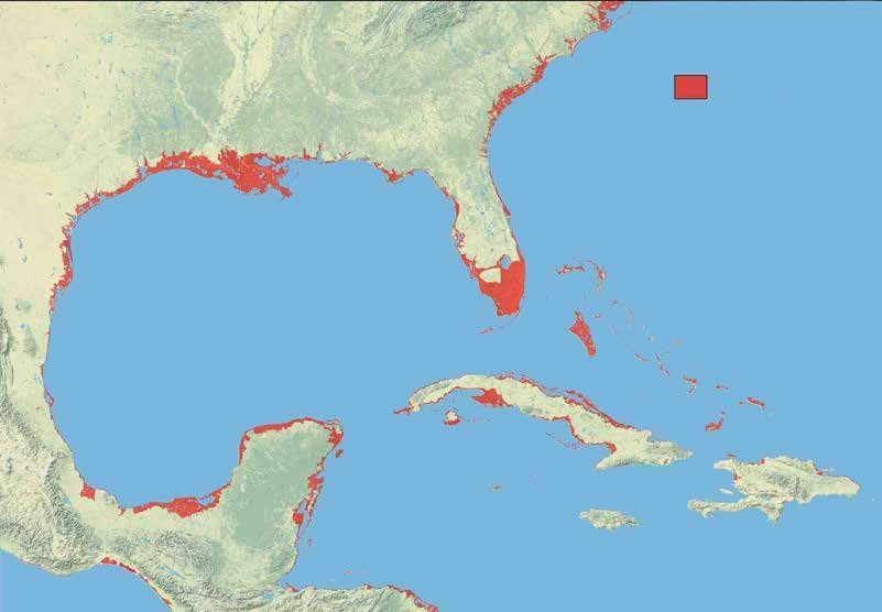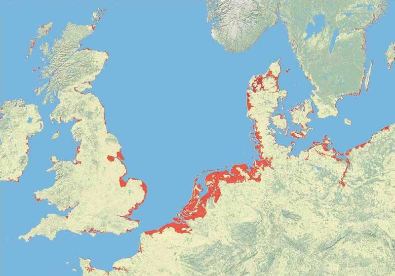 Figure 2.6.3 Forecasts of coastal flooding on different continents, assuming a rise of sea levels by 5 m