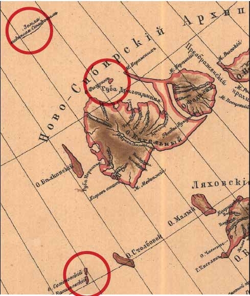 Figure 2.6.8 Coastal erosion in the Arctic. On this section of a map from 1890 showing the Laptev Sea and the New Siberian Islands the red circles highlight islands that no longer exist (they were swallowed up by sea storms)