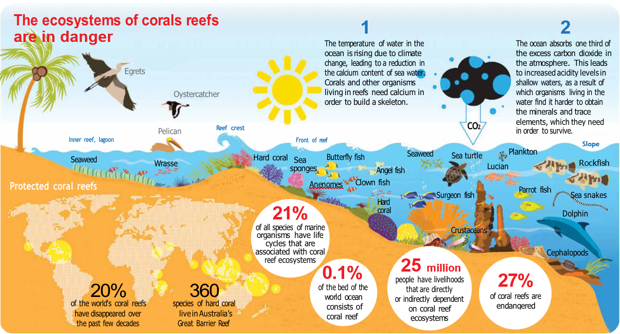 A long-term increase in the temperature of sea water may lead to major degradation of the whole coral reef ecosystem. Coral atolls, which serve as a habitat for a great number of living organ- isms, may be destroyed. Forecasts by the IPCC suggest that 18% of the world’s coral reefs will be lost in the next three decades because of a variety of factors.