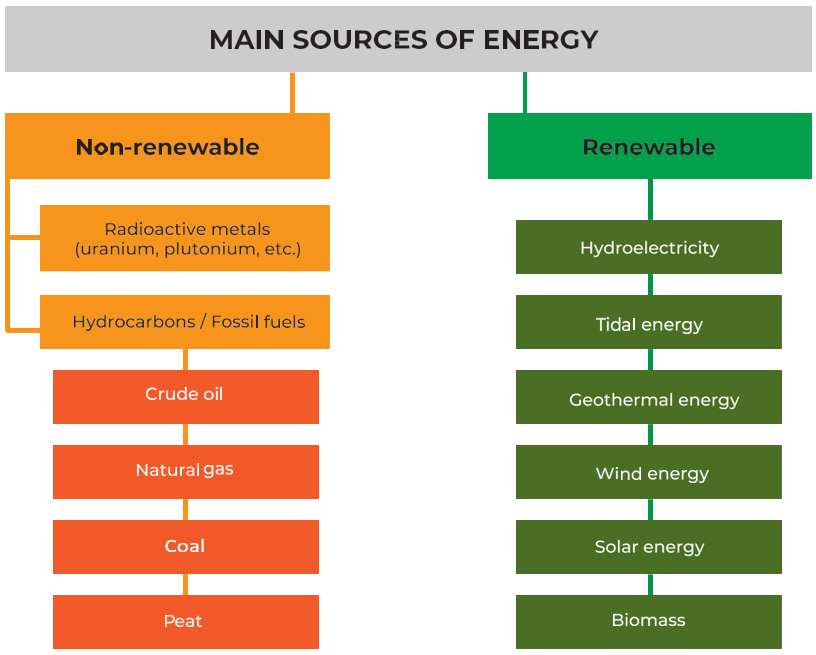 People learnt to make electricity by transforming types of energy, which they found in nature. Natural sources of energy on our planet are usually subdivided into two major groups: non- renewable (traditional) and renewable (alternative) (Fig. 3.1.2).