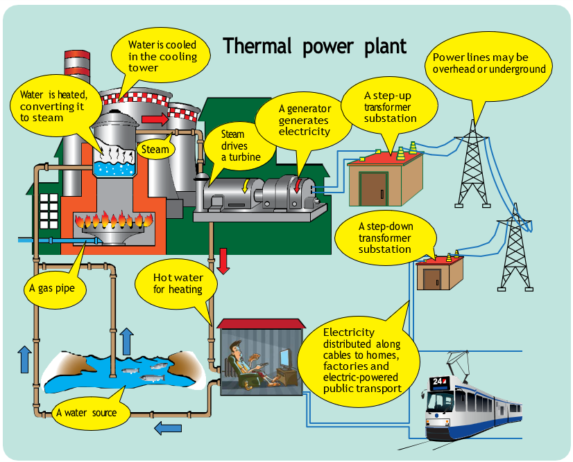 The combustion of fossil fuels, also known as hydrocarbons – coal, oil, or natural gas – can be used to produce electricity. This process occurs at thermal power plants. The engine room of a thermal power plant is fitted with a boiler and the combustion of fuel heats the water in this boiler, converting it into steam. The vapour pressure of the steam makes the blade of a turbine rotate and the turbine then drives a generator, which generates electric current. The electricity is carried to homes and other facilities by power lines (Fig. 3.1.4).