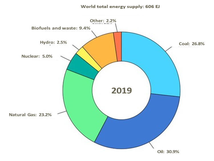 In 2019, fossil fuels dominated and accounted for 80.9% of all the primary energy supply of the world and their use was as follows: 30.9% for oil, 26.8% for coal and 23.2% for natural gas (Fig. 3.1.5).