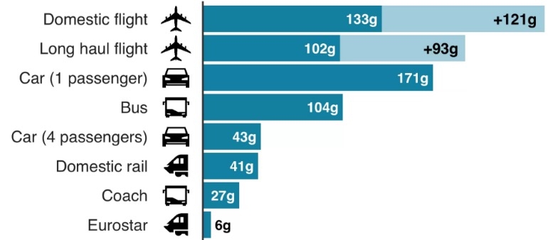 The UK estimated the emissions per passenger per kilometre travelled in different modes of transport. It shows that taking a flight leads to more than 20 times more emissions than taking the train, Eurostar (Fig. 3.2.7).