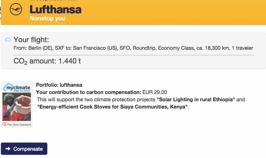 Figure 3.2.10 Calculation of CO2 emissions and appropriate compensation for a Berlin–San Francisco return flight in economy class with Lufthansa