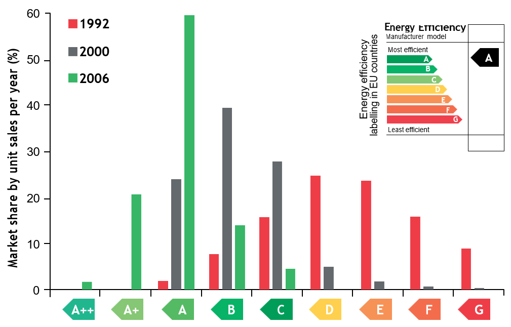 Figure 3.2.16 Impact of energy-efficiency labelling and minimum energy-efficiency standards on the EU market for refrigerators and freezers