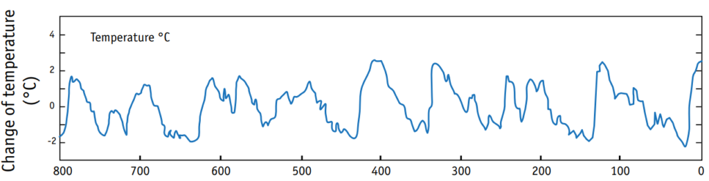 Figure 1.3.5 Change in temperature on Earth over the last 800,000 years relative to the average temperature