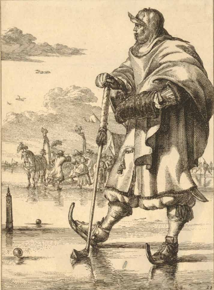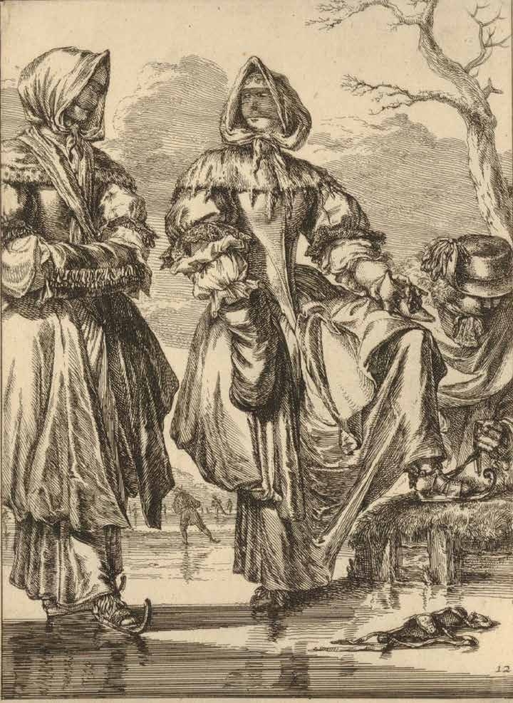 Figure 1.3.8 Dutch people skating on a frozen canal. Engravings from the series Fashionable characters by Romeyn de Hooghe (Netherlands, 1682–1702)