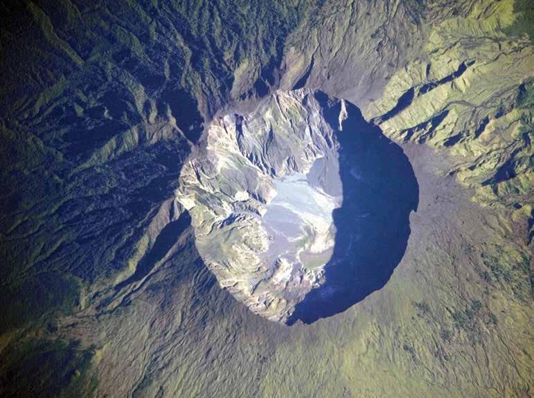 Figure 1.3.9 Mount Tambora volcano on the island of Sumbawa in Indonesia. The massive eruption of 1815 caused its top part to collapse, forming a crater six km wide and one km deep