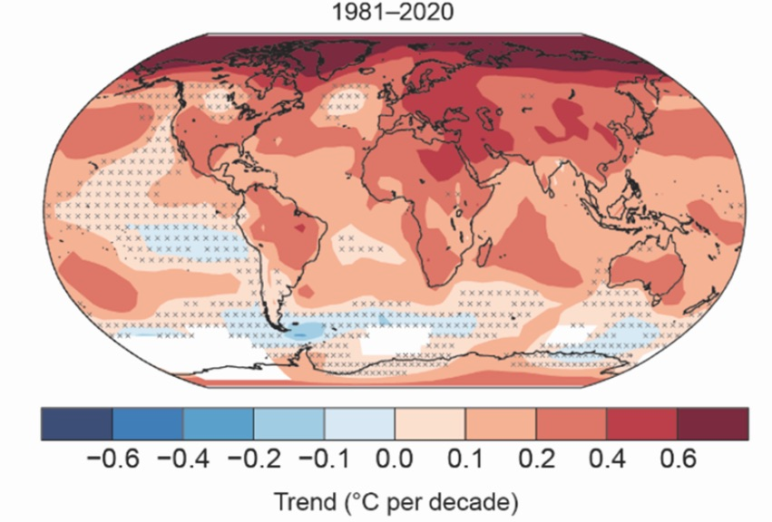 Figure 1.4.1 Map of comparative trends in decadal changes in temperature in different regions of the world (1981-2020 and 1850-1900)
