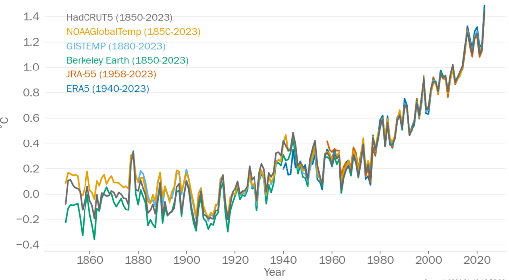 Figure 1.4.5 Increase in the global mean temperature on Earth between 1850 and 2023 as shown by different meteorological centres