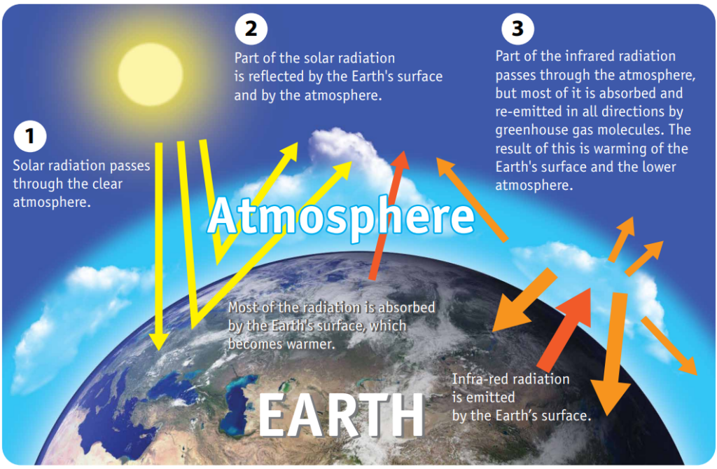 Figure 1.4.2 The Earth’s energy balance and the greenhouse effect