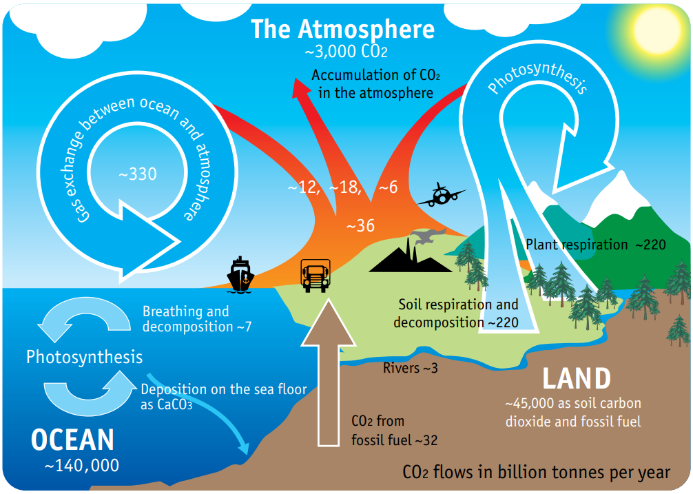 Natural processes like respiration in living organisms, decomposition, ocean-atmosphere exchange, volcanic activity, and wildfires release CO2 into the atmosphere, playing key roles in the Earth’s carbon cycle (Fig. 1.4.4). However, isotope analysis reveals that the recent rise in atmospheric CO2 primarily stems from human activities, such as burning fossil fuels, which is distinctively different in molecular composition from CO2 released by these natural processes.