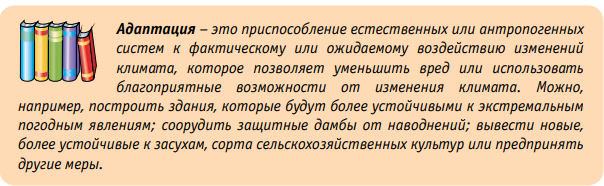 Чтобы снизить ущерб от климатических изменений, человечеству необходимо заранее предпринимать соответствующие предупредительные меры, так называемые меры адаптации.