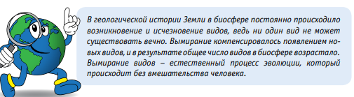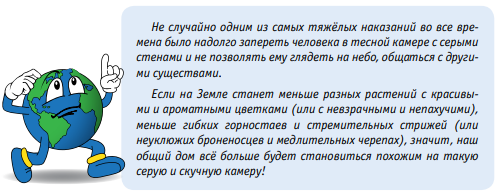Все растения и животные, все микроорганизмы и грибы образуют очень сложно устроенную и тонко отрегулированную систему. Представьте, что вы с друзьями на целых два года оказались на космическом корабле, который должен долететь до Марса и вернуться. Сколько же в нём разных деталей, приборов, механизмов! Подумайте, не похожа ли наша планета на такой корабль? Каждая «деталь» в нём создавалась миллионами лет эволюции, её действие настраивалось на совместную работу с тысячами других «деталей». Что же случится, если из-за ошибки экипажа или удара метеорита повредится несколько устройств? На первое время их можно заменить другими похожими. А если ещё один удар космической стихии, тогда что?