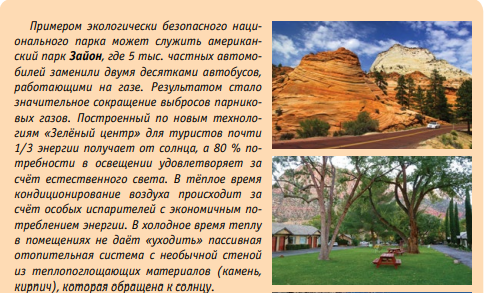 Какой же вклад может внести национальный парк (да и любая другая охраняемая территория) в решение проблемы изменения климата? Самый значительный вклад – уменьшение выбросов в атмосферу углекислого газа. Некоторые парки, например, предлагают туристам передвигаться не на частных автомобилях, а на общественных автобусах, работающих к тому же на альтернативном топливе. Сами сотрудники парка также используют транспорт, минимально влияющий на окружающую среду. В местах обслуживания посетителей энергию получают от ветра, солнца, тёплых горячих источников. Максимально используется естественное освещение, светодиоды, а энергию для служебных зданий дают солнечные