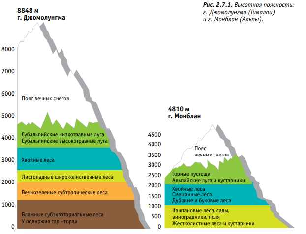 Горы играют важную роль в формировании климата. Они создают барьер для воздушных масс, которым сложно преодолеть высокие вершины. По этой причине разные склоны гор часто имеют непохожие климатические условия: с одной стороны осадков выпадает больше, с другой – меньше; также могут сильно отличаться средняя температура воздуха и ландшафты. Ещё одна уникальная особенность гор – высотная поясность. Проявляется она следующим образом: по мере нарастания высоты в горах происходит смена климатических и ландшафтных зон (Рис. 2.7.1).