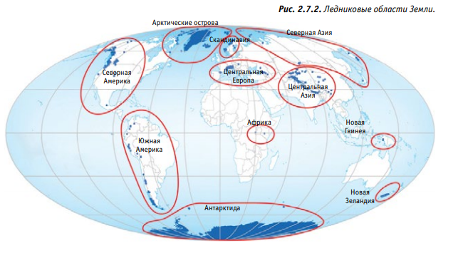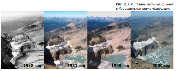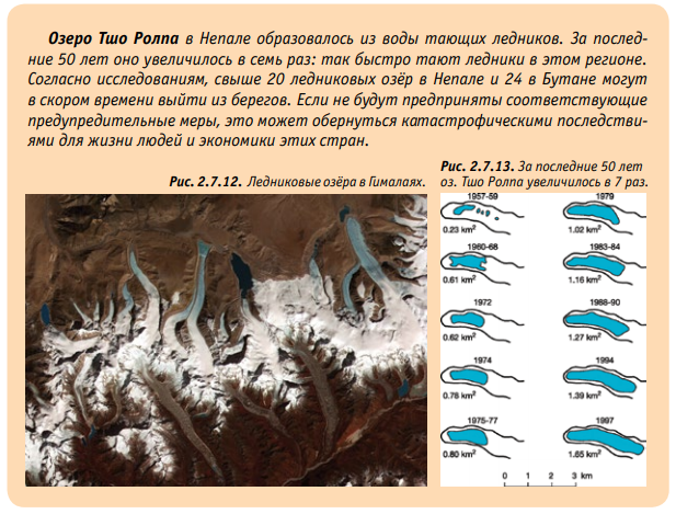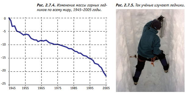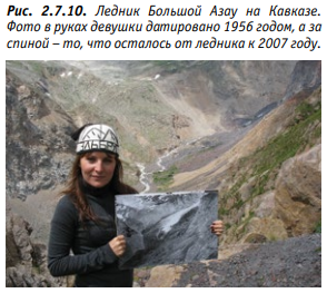 Однако за последние 40 лет ледники по всему миру отступают особенно быстро (Рис. 2.7.4). Учёные бьют тревогу: стремительное таяние ледников в горах, которое происходит в наши дни, никак не вписывается в естественные циклы! Самое опасное то, что сокращение объёма льда в горах может привести к катастрофическим последствиям для природы и экономики горных регионов, а также предгорных равнин, на которых проживает, ни много ни мало, 1/6 населения Земли!