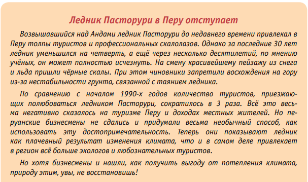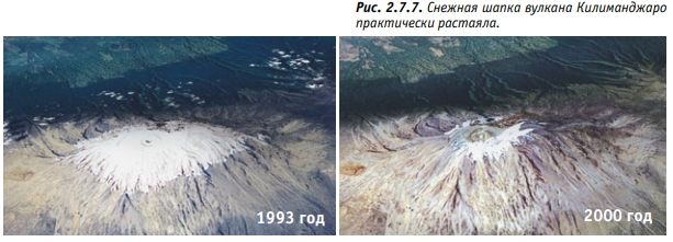 Чрезвычайно быстро отступают ледники в Перу. За последние 30 лет их площадь уменьшилась, по самым скромным подсчётам, на треть. Катастрофа настигла вулкан Килиманджаро в Африке: знаменитая ледовая шапка, прославленная некогда американским писателем Э. Хемингуэем в рассказе «Снега Килиманджаро», практически растаяла!