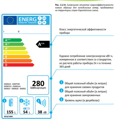 Европейская этикетка энергоэффективности (European energy label) обязательна для некоторых бытовых электроприборов и ламп, продаваемых в странах ЕС с 1995 года (Рис. 3.2.9). Цель этой этикетки – дать покупателям возможность сравнить энергоэффективность, а также некоторые свойства аналогичных товаров одного или нескольких производителей. Наиболее энергоэффективны товары, имеющие класс энергоэффективности «А», либо «А+», «А++», «А+++»