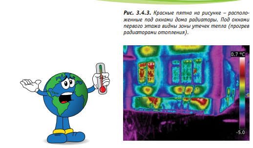 Для того чтобы увидеть, насколько хорошо сохраняют тепло стены, перекрытия, окна, и определить, где происходят утечки тепла, используют тепловизоры – приборы, позволяющие оценить распределение температуры любой поверхности, например, стены жилого дома. Распределение температуры отображается на дисплее (и в памяти) камеры как цветовое поле, где определённой температуре соответствует определённый цвет. Рядом с изображением всегда приводят шкалу, показывающую соответствие цвета на рисунке и температуры.