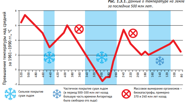На протяжении сотен миллионов лет истории Земли температура менялась очень сильно – примерно на 10 °С (Рис. 1.3.1). Это очень много! Если бы сейчас было на 10 °C теплее, то в Северной Европе климат был бы совсем иным, а средняя годовая температура в Стокгольме – как на средиземноморском побережье, например в Барселоне или Марселе. Казалось бы, что в этом плохого? Но ведь тогда в Южной Европе было бы жарко как в Дубае. Зимой ещё неплохо, но летом слишком жарко! А на Аравийском полуострове стало бы просто невозможно жить.