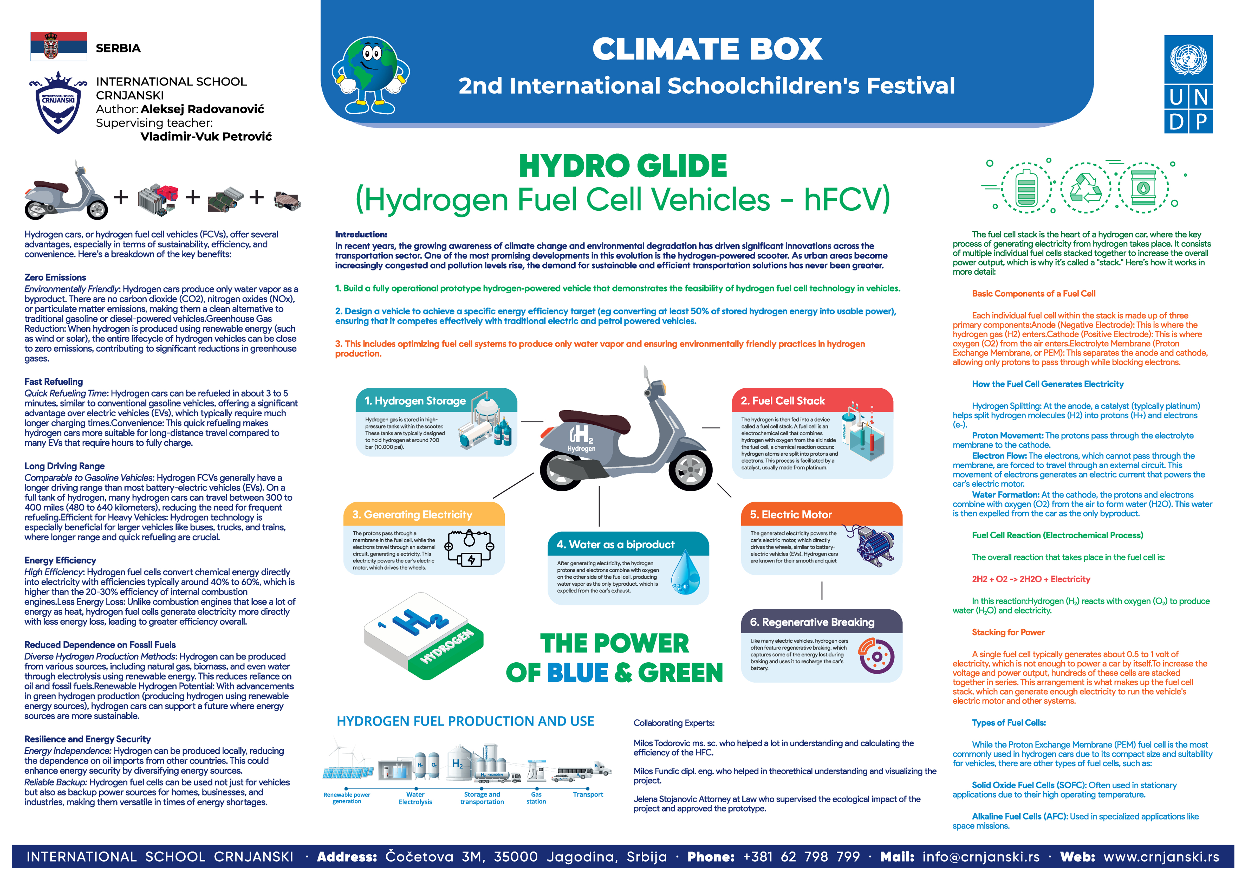 Резиме:As part of the Hydro Glide project, students in Jagodina, Serbia, developed a prototype hydrogen-powered vehicle to demonstrate the feasibility of hydrogen fuel cell technology in transportation. They designed and built an energy-efficient test vehicle that utilizes hydrogen as a clean fuel source, producing only water vapor as a byproduct. The project involved research on hydrogen storage, fuel cell functionality, and emission reduction benefits. By successfully integrating hydrogen technology into a working model, the initiative showcased the potential of sustainable transport and contributed to raising awareness about clean energy solutions.